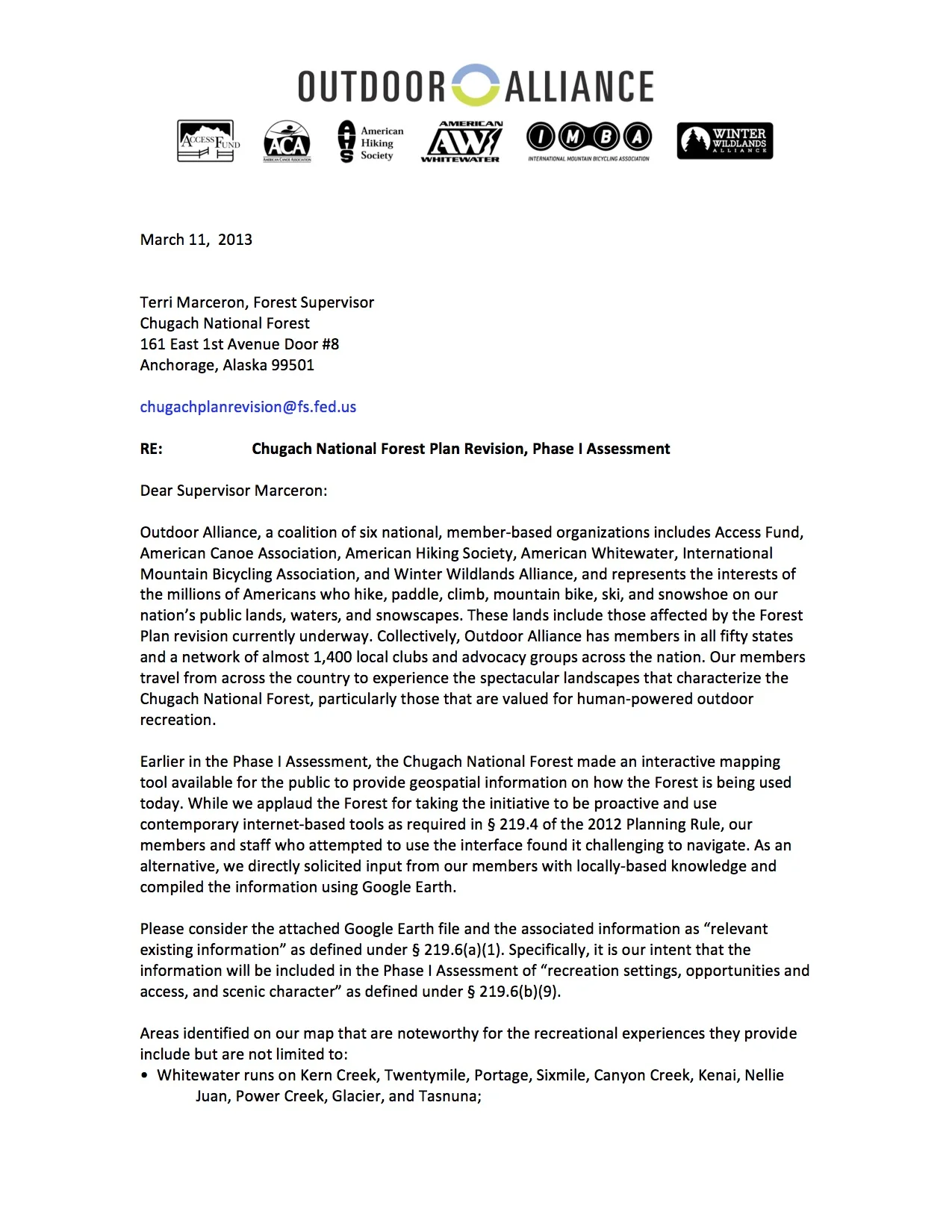 Here is our letter to the Chugach and our KMZ map file.